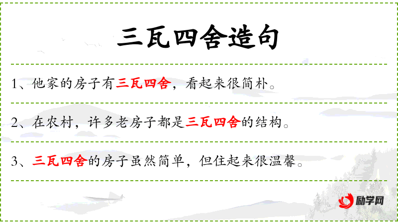 句子:“他们家虽然只有三瓦四舍,但收拾得很干净整洁。”