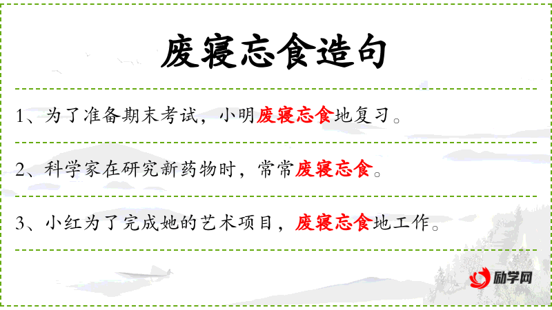 句子:“老师为了批改学生的作业,经常废寝忘食。”