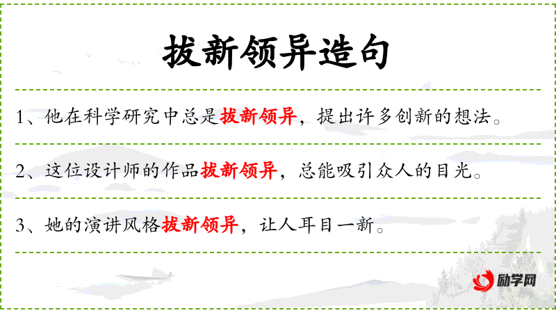 1. 【拔新领异】 拔:抽出;新:新意;领:具有;异:指独特之处。指创立新意,提出独特的见解。
