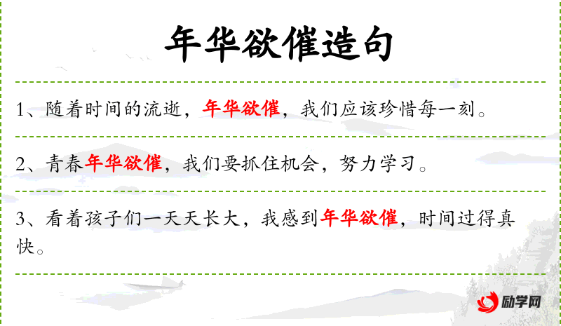 句子:“随着时间的流逝,年华欲催,我们应该珍惜每一刻。”