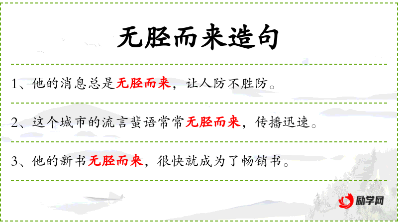 - 状语:“无胫而来”