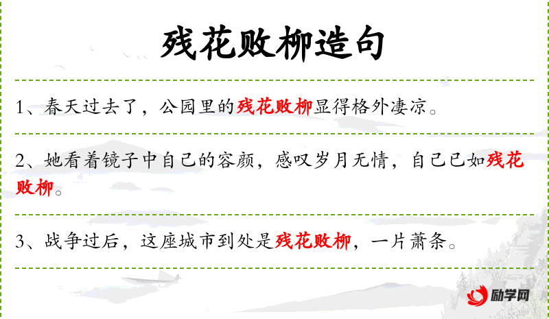 败:衰败。残:凋残。凋残的柳树,残败了的花。旧时用以比喻生活放荡或被蹂躏遗弃的女子。
