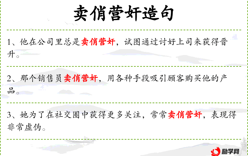 - 卖俏:动词,表示故意表现得很吸引人,通常带有贬义。