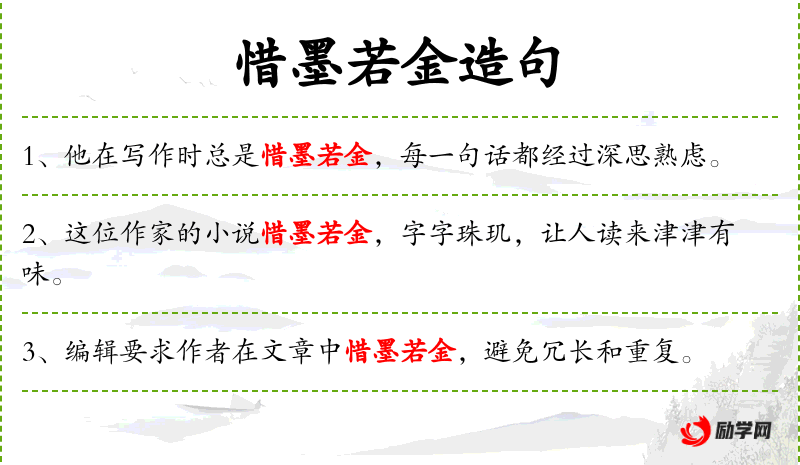 - 惜墨若金:形容说话或写作非常谨慎,不轻易浪费言辞,比喻用词精炼,每一句都很有价值。