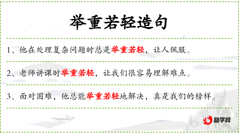 - 举重若轻:比喻处理困难的事情像处理简单的事情一样轻松。