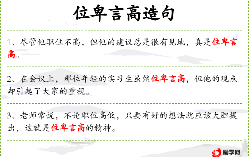 - 位卑言高:指地位虽低,但言论或建议却很有价值。