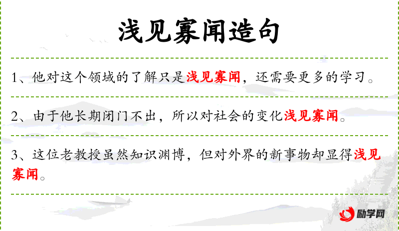 1. 【浅见寡闻】 - 浅见:肤浅的见解;寡闻:听到的很少。形容见闻不广,所知不多。