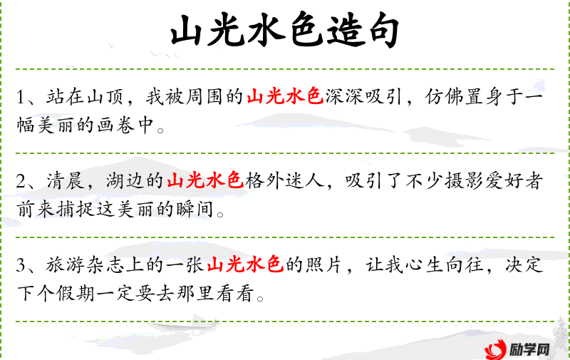 句子中提到的“山光水色”是文化中常见的自然美景的表达,体现了人对自然美的追求和欣赏。这种表达方式在**的山水画中尤为常见。