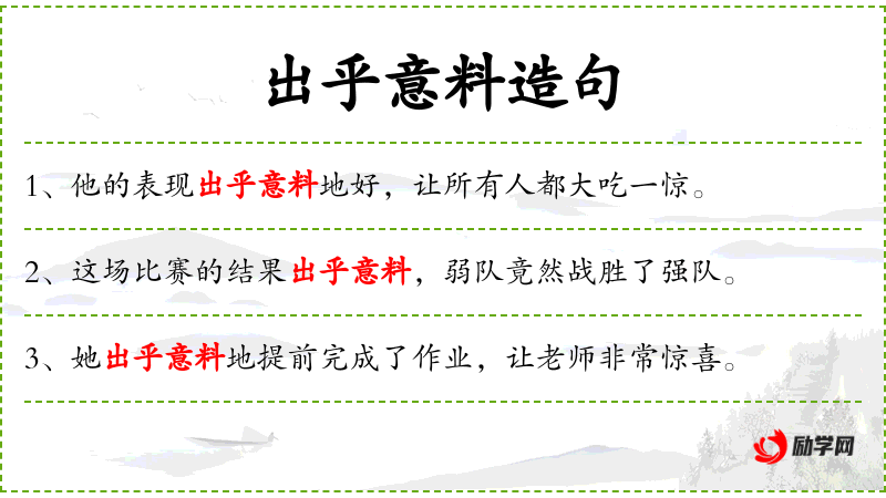出乎意料地:副词短语,表示与预期相反