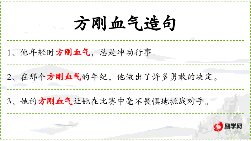 1. 【方刚血气】 方:正;刚:强劲;血气:精力。形容年青人精力正旺盛。