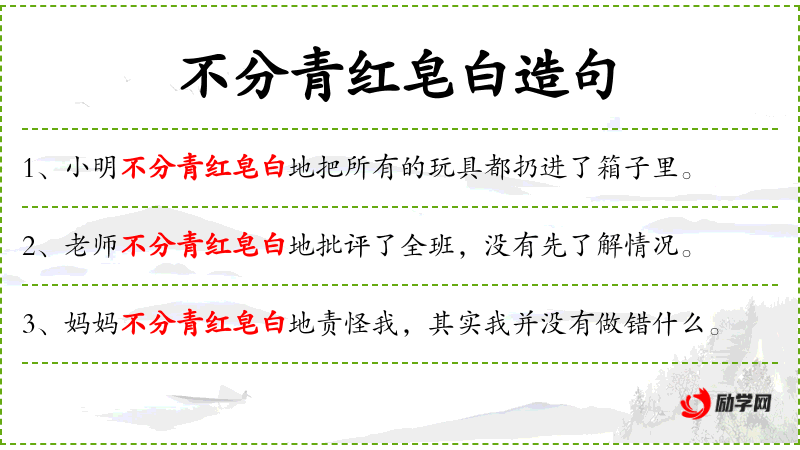 2. 【不分青红皂白】 - 皂:黑色。不分黑白,不分是非。