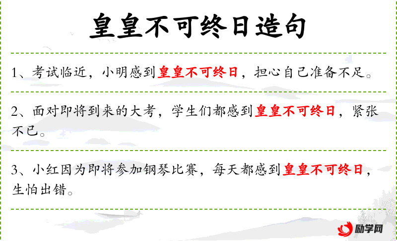 6. 【皇皇不可终日】 - 惊慌地连一天都过不下去。形容惊恐不安到了极点。
