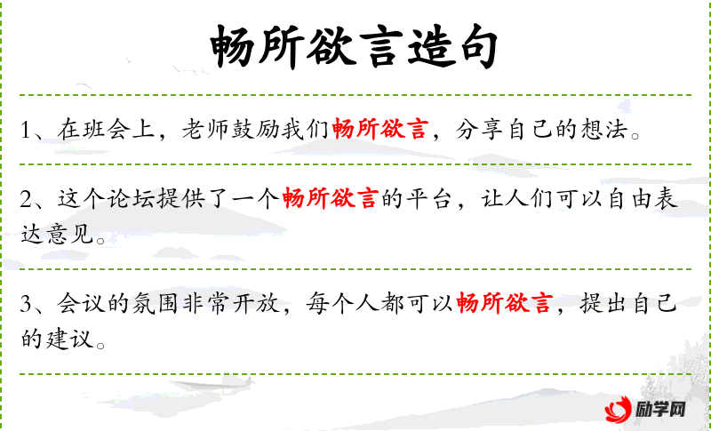 6. 【畅所欲言】 畅:尽情,痛快。畅快地把要说的话都说出来。