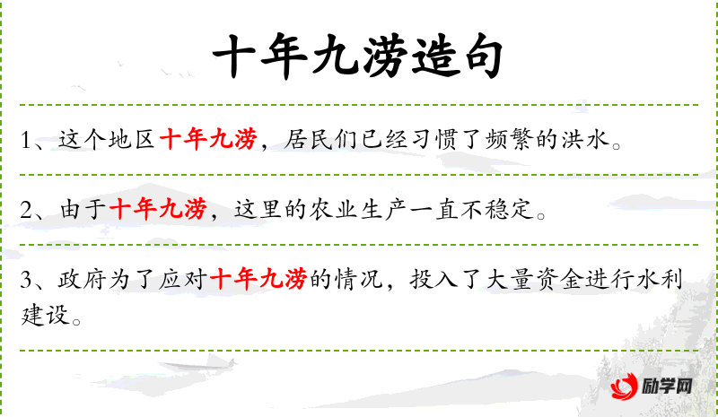- 为了提高孩子们的安全意识,学校教授他们应对十年九涝的方法。