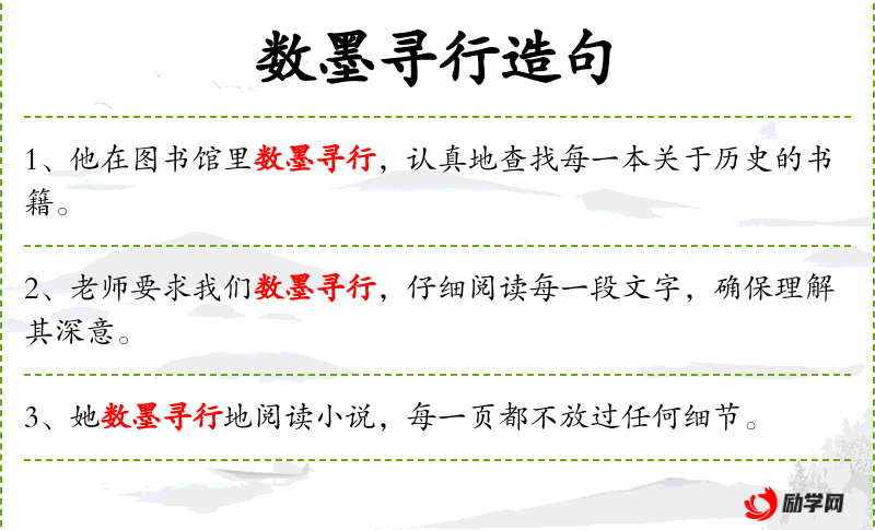 - 数墨寻行:这是一个成语,意为仔细阅读和查找资料。