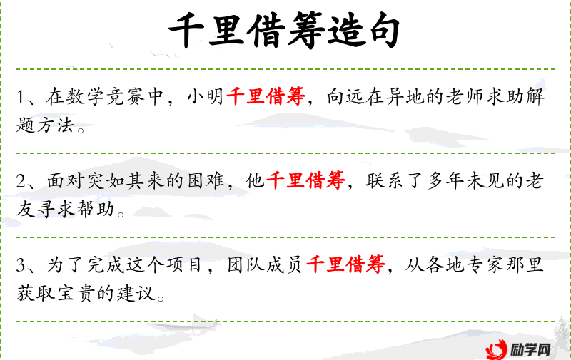 - 状语:在数学竞赛中、千里借筹、向远在异地的老师