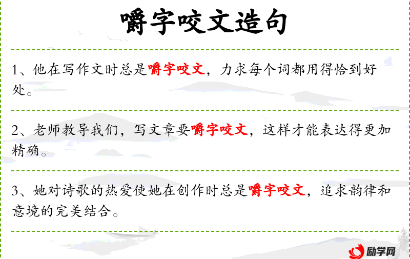 - 嚼字咬文:仔细斟酌每一个字词,力求精确和优美