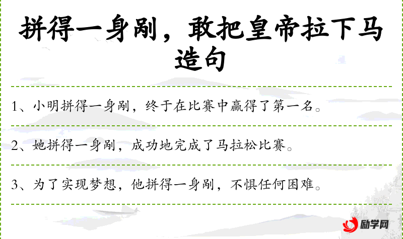 - 拼得一身剐:这个成语反映了**人对于努力和牺牲的价值观,强调了在追求卓越过程中可能需要付出的代价。
