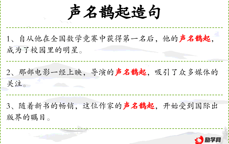 - 相关成语:声名鹊起(形容名声迅速上升)