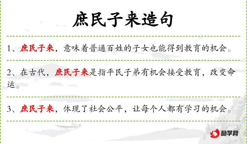 句子:“庶民子来,体现了社会公平,让每个人都有学*的机会。”