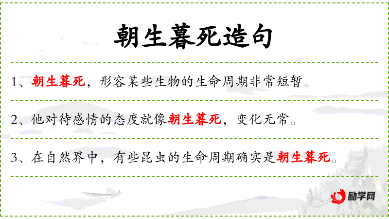 3. 【朝生暮死】 - ①早晨刚生,晚上就死亡。②今亦形容事物生命短暂。