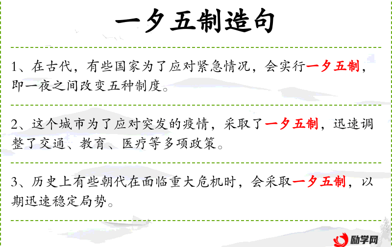 句子中提到的“一夕五制”可能是一个特定的政策或措施,具体含义需要更多上下文来确定。如果这是一个特定地区的术语或政策,可能涉及该地区的文化或*俗。