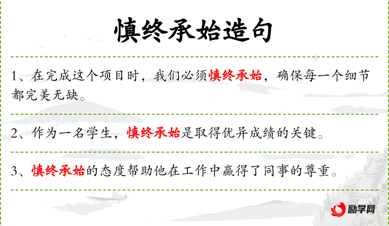 - 文化背景:**文化中强调“慎始敬终”,即开始时要谨慎,结束时要尊重,这与“慎终承始”相呼应。