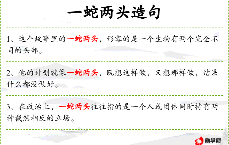 “一蛇两头”是一个成语,比喻事物具有两面性或矛盾性。这个成语在文化中常用来形容人的复杂心理或事物的复杂性。