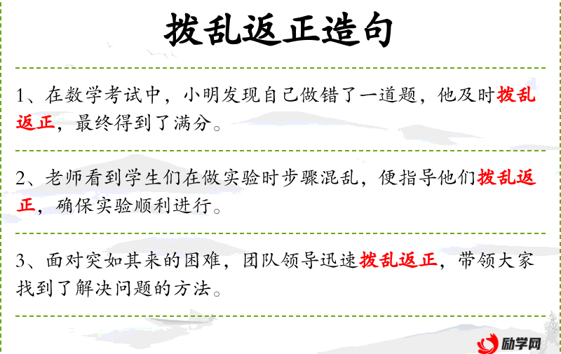 - 成语:“拨乱返正”是**传统文化中的成语,体现了纠正错误、回归正道的文化价值观。