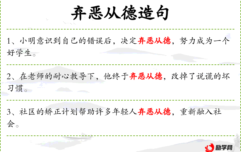 - 弃恶从德:成语,表示放弃恶行,转向善行。