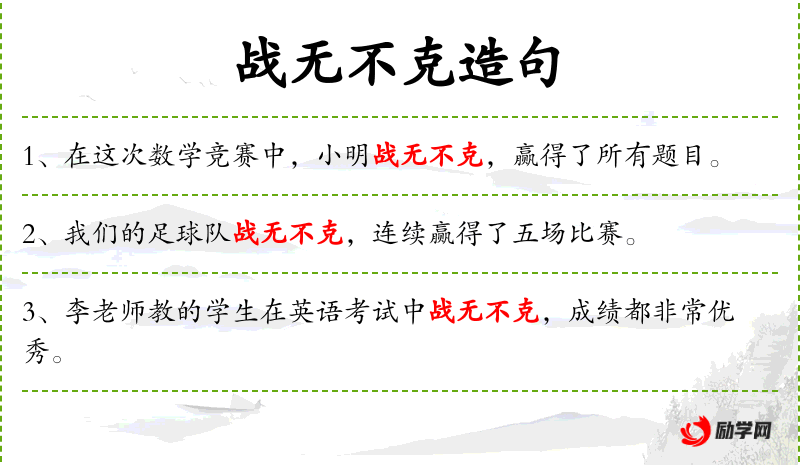 - 使用“战无不克”这样的成语增加了句子的文雅和修辞效果。