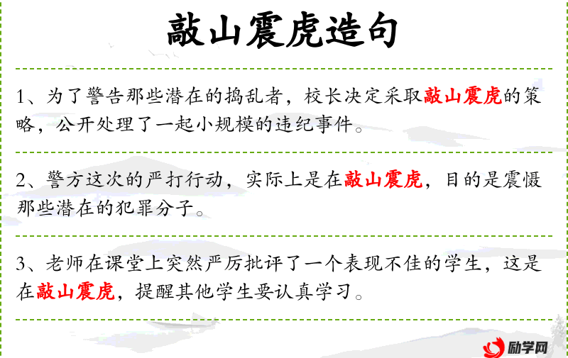- 敲山震虎:成语,比喻采取某种行动以警告或震慑其他人。