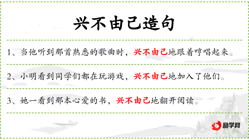 - 状语:当他听到那首熟悉的歌曲时、兴不由己地