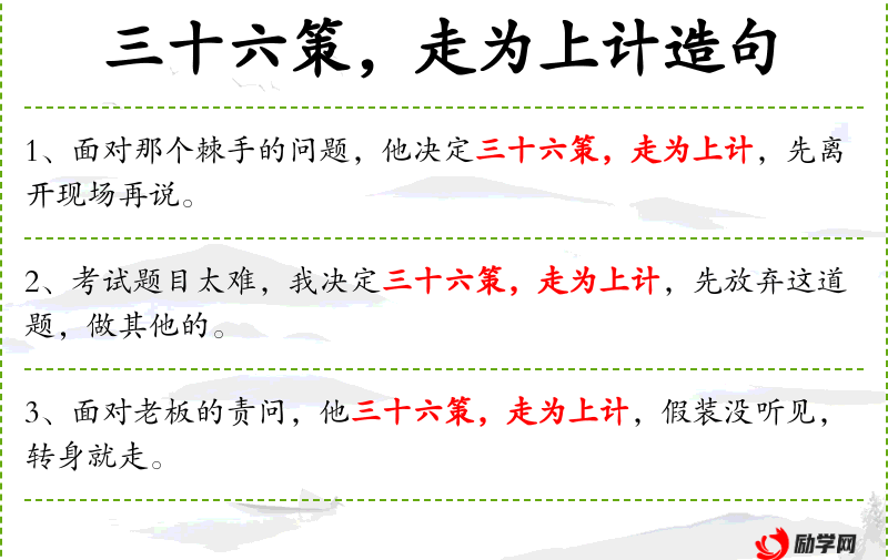 7. 【走为上计】 遇到强敌或陷于困境时,以离开回避为最好的策略。