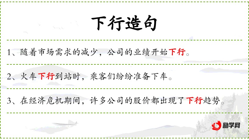 1. 【下行】 - 文字自上而下直写直排的形式『字在改为横写横排以前,书写和印刷都是从上到下的,故称"下行"; 公文从上级发往下级; 船从上游向下游行驶; 指声音从高到低。