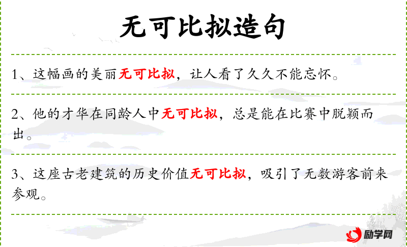 1. 【无可比拟】 比拟:比较。没有可以相比的。