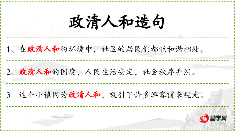 句子:“这个小镇因为政清人和,吸引了许多游客前来观光。”