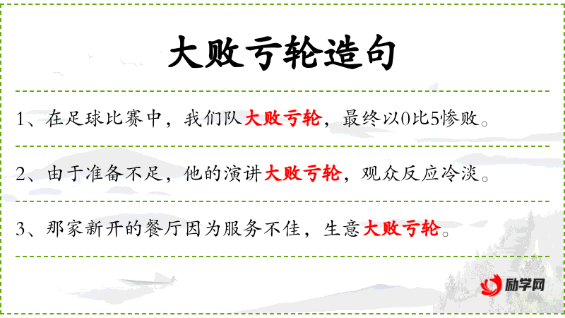成语:大败亏轮(形容失败得很惨) 文化意义:在**文化中,准备充分被视为成功的重要因素,缺乏准备往往会导致失败。