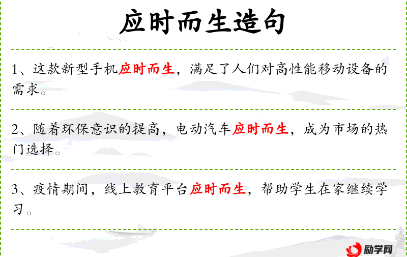 - 应时而生:表示在特定时期或环境下产生或出现。