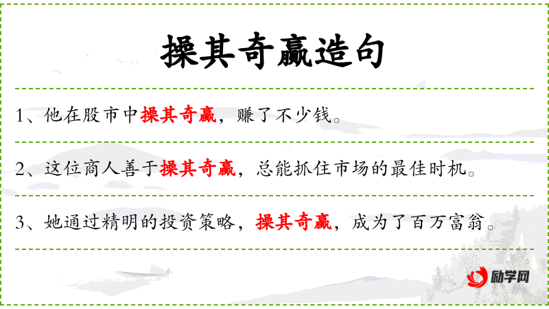 - 操其奇赢:动词短语,意为巧妙地利用市场波动获利。