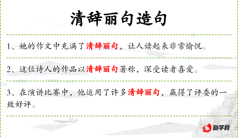 3. 【清辞丽句】 - 指清新美丽的词句。同“清词丽句”。