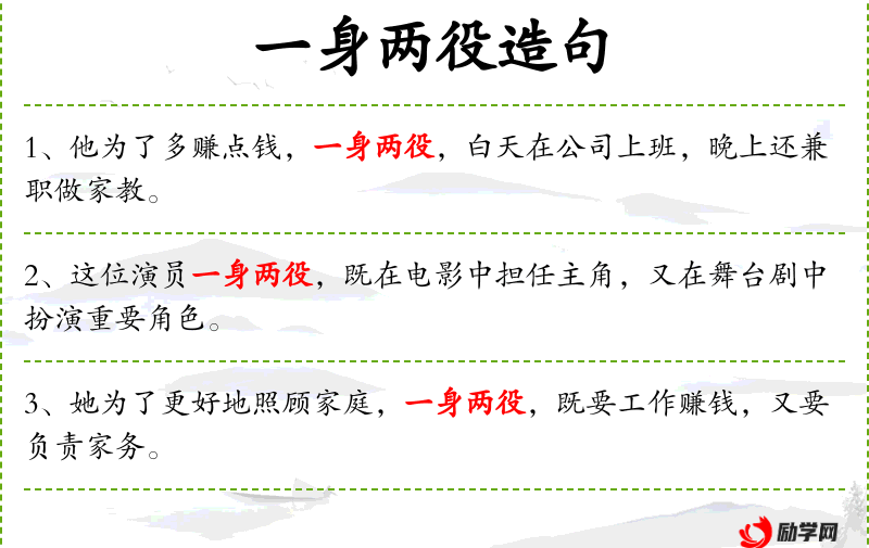 - 相关成语:“一箭双雕”(同时达到两个目的)与“一身两役”有相似的含义。