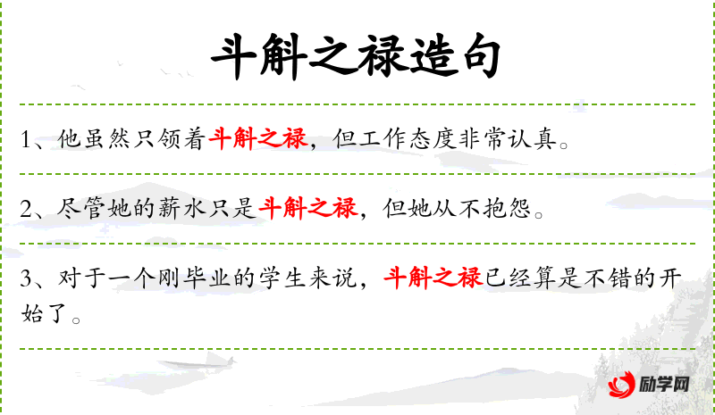 - 斗斛之禄:这个成语源自古代,斗和斛都是古代的容量单位,比喻收入微*。