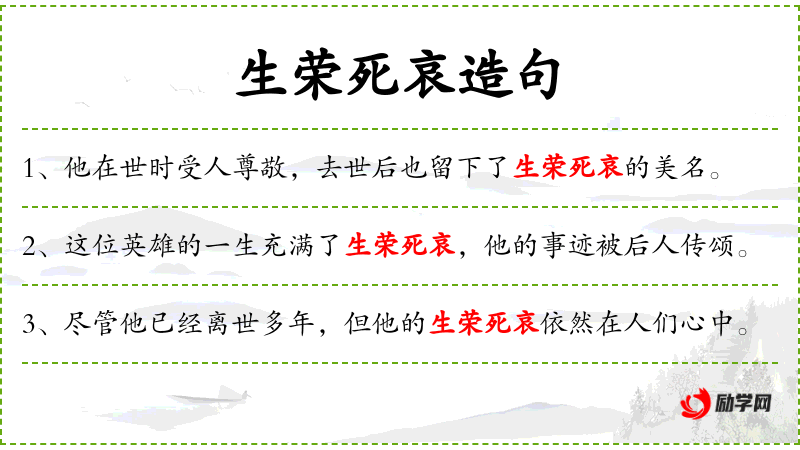 5. 【生荣死哀】 活着受人尊敬,死了使人哀痛。用以赞誉受人崇敬的死者。