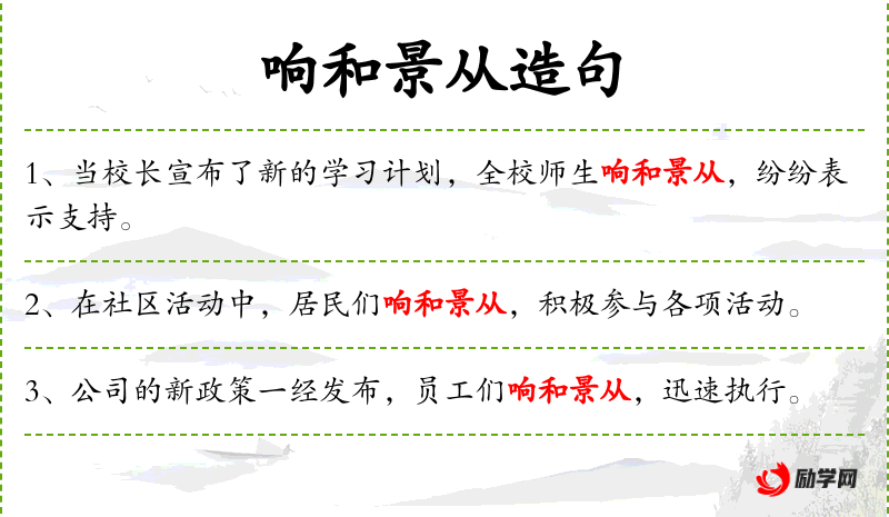 - 响景从:这个词组可能是误用或打字错误,正确的表达可能是“响应”或“支持”。