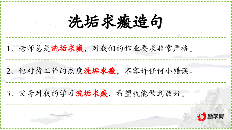 1. 【洗垢求瘢】 - 垢:污垢;瘢:瘢痕。洗掉污垢来寻找瘢痕。比喻想尽办法挑剔别人的缺点。