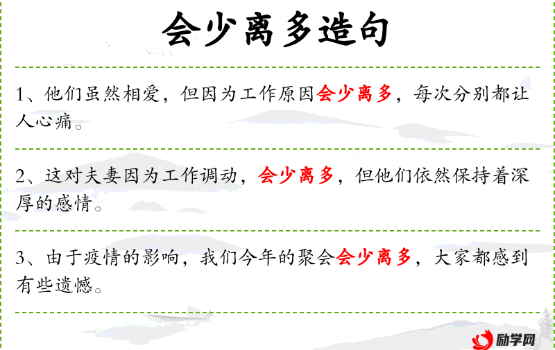 4. 【会少离多】 相会少,别离多。感慨人生聚散无常或别离之苦。