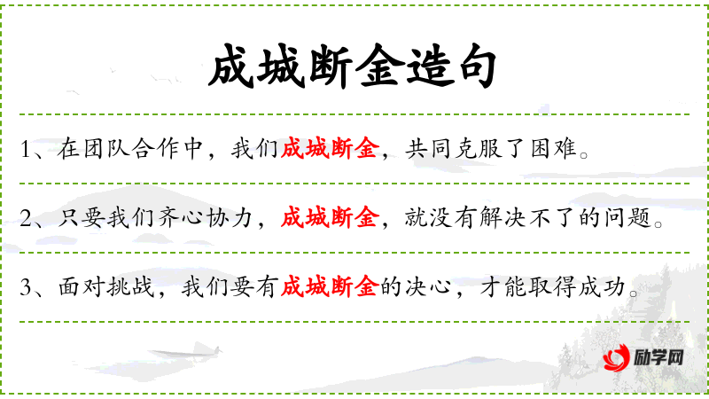 - 成城断金:这个成语源自《左传·僖公二十四年》,原文是“众志成城,众口铄金”,后来演变为“成城断金”,强调团结的力量。