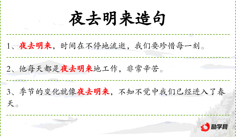 - 夜去明来:表示时间的流逝,夜晚过去,白天到来。