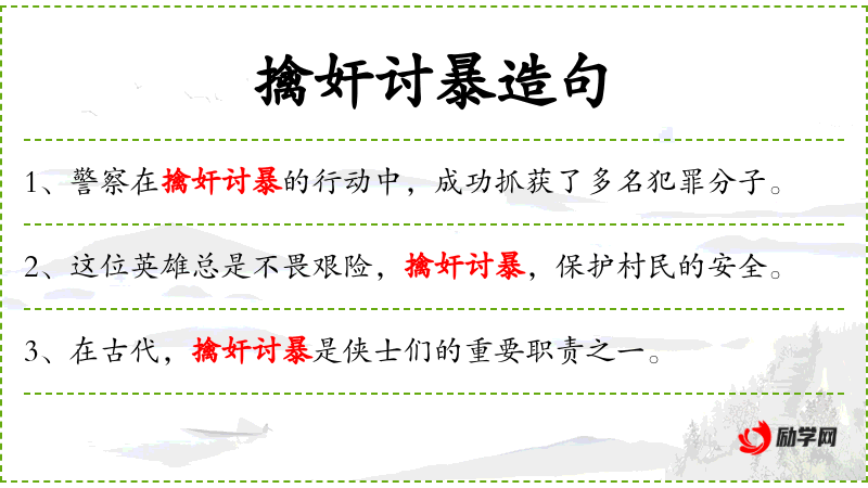 - 擒奸讨暴:动词短语,表示捕捉坏人,讨伐暴力